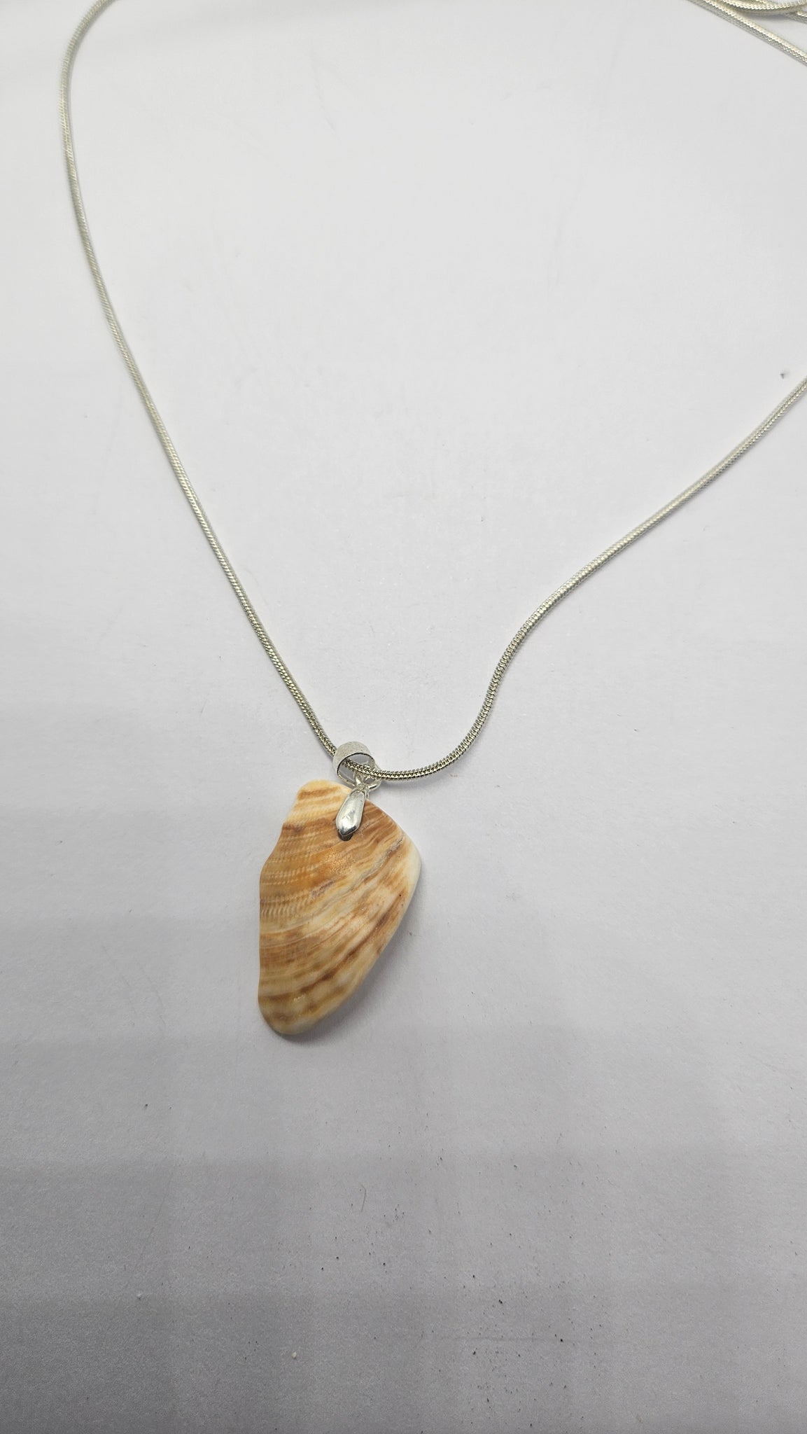 - D'un collier en chaine fine et torsadée en argent sterling taille 70 cm de Longueur et son pendentif en fragment de coquillage poli par l'océan.